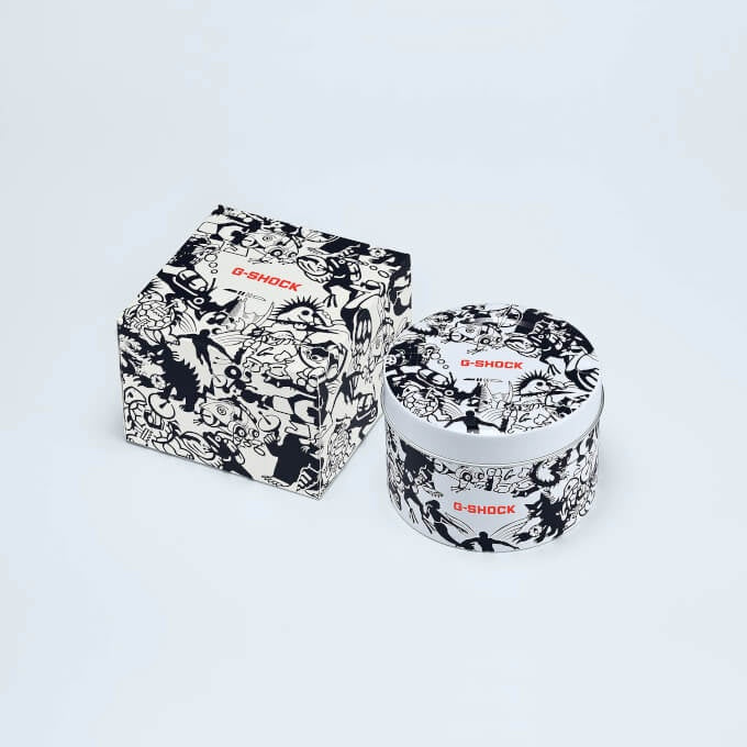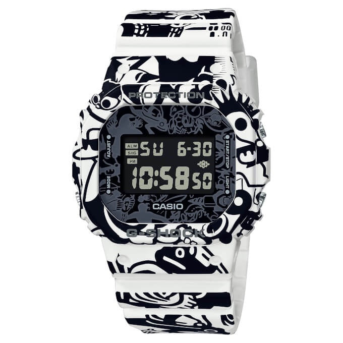 G-Shock DW-5600GU-7, announced for a July 2022 release in Japan and Asia, features a unique printed pattern consisting of 18 character drawings from the engraved case backs of current and past “Master of G” models, giving it an artistic camouflage style. The black pattern appears on the white bezel and band, and extends to the black face in gray. The band keeper is translucent resin, allowing the underlying pattern to be visible. The limited edition watch comes in a matching box and tin case.